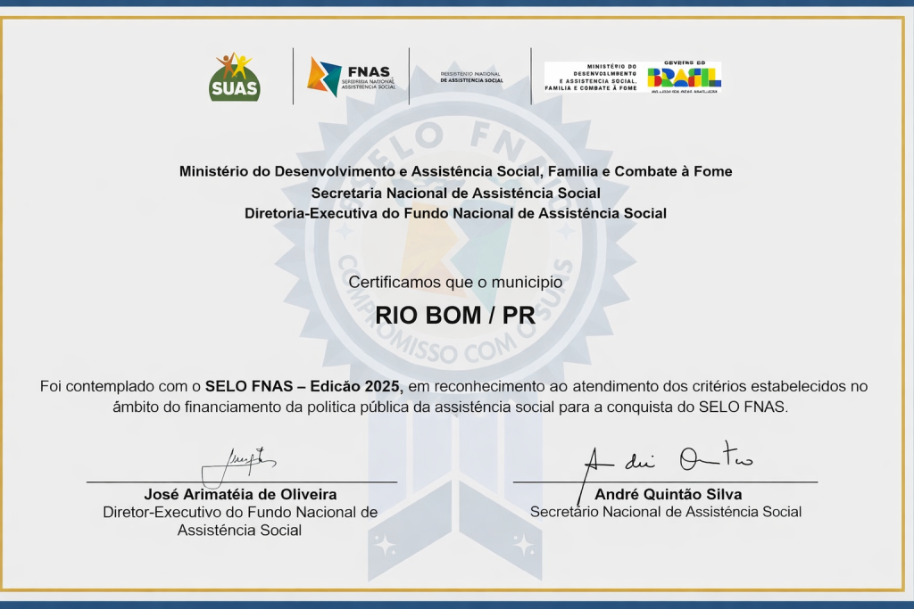 Emitido pelo Ministério do Desenvolvimento e Assistência Social, Família e Combate à Fome, por meio da Secretaria Nacional de Assistência Social, o reconhecimento posiciona Rio Bom entre as cidades que se destacam pela seriedade e pela busca permanente da melhoria das políticas públicas voltadas ao bem-estar social.