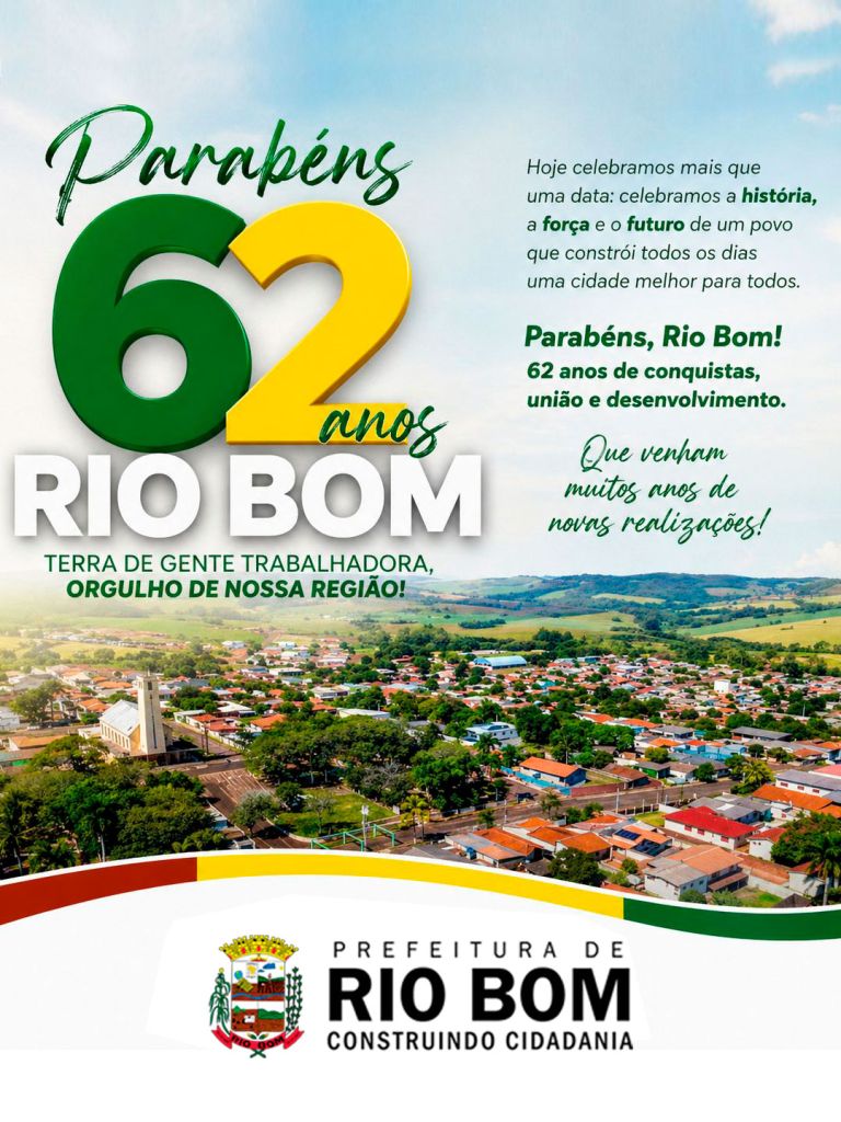 O município de Rio Bom comemora nesta semana mais um aniversário de emancipação política, reforçando sua trajetória marcada pelo desenvolvimento, pelas tradições e pela forte identidade cultural construída ao longo das décadas.