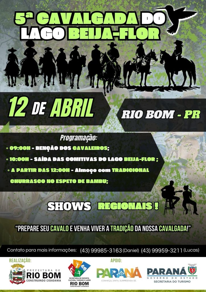 A Prefeitura de Rio Bom, por meio da Secretaria Municipal de Esporte, Cultura, Turismo e Lazer, promove no próximo dia 12 de abril a 5ª Cavalgada do Lago Beija-Flor, evento que já se tornou tradição no município e que celebra a cultura sertaneja e as raízes do campo.