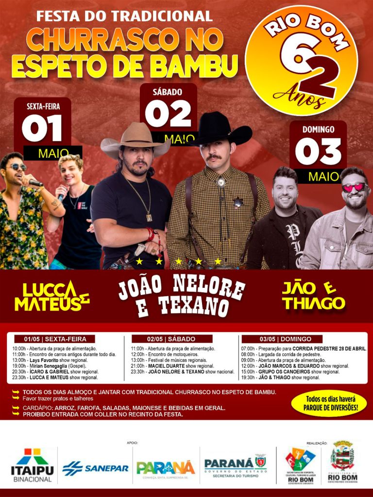 Além das atrações musicais, o evento contará com uma programação diversificada, incluindo shows regionais, atividades esportivas, encontros temáticos e o tradicional churrasco no espeto de bambu, servido diariamente no almoço e jantar — uma das principais marcas registradas da festa e do município.